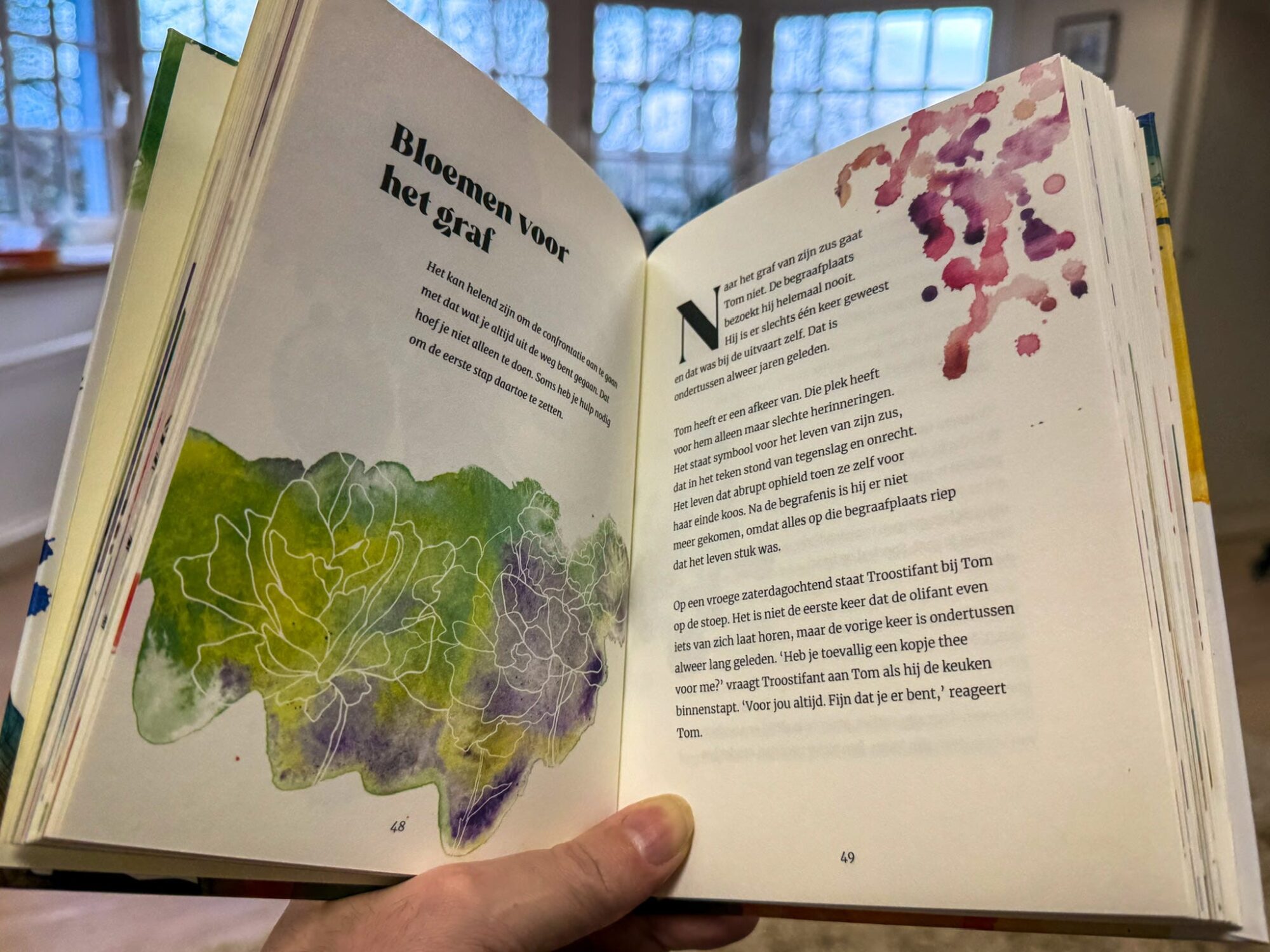 Wat ik misschien wel het mooiste vind: Troostifant is geen held. Hij is niet slim of bijzonder wijs. Hij struikelt. Hij morst thee. Soms zegt hij het verkeerde. En toch… of juist daarom… houden mensen van hem. Omdat hij niet doet alsof hij het allemaal weet.